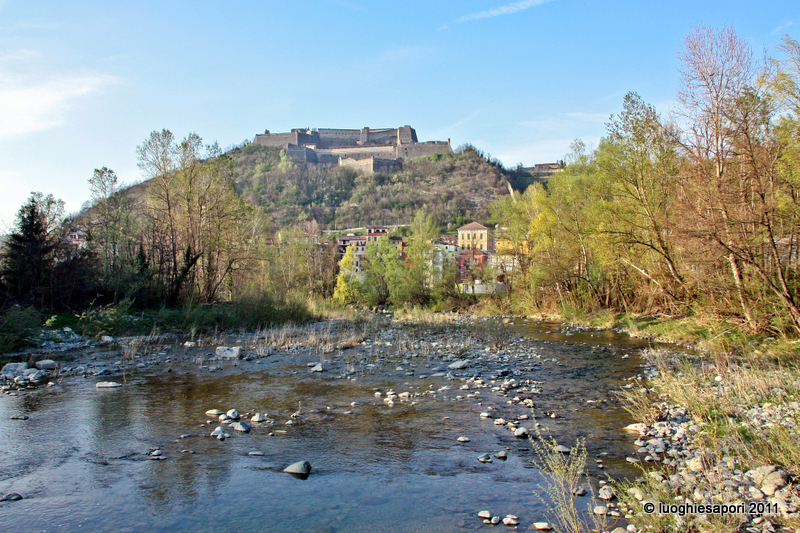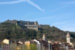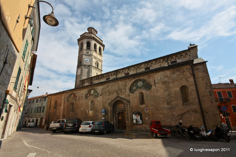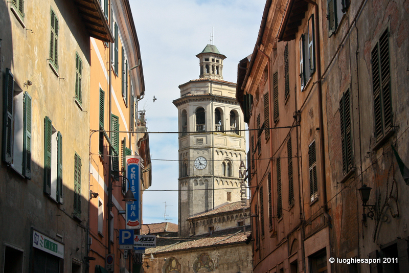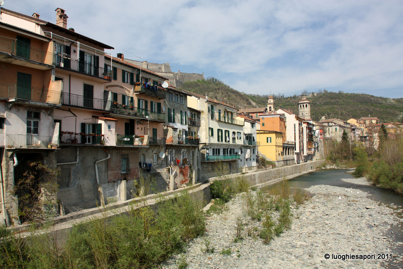 – Gavi. Lasciata l’automobile in un parcheggio alle porte della cittadina, subito dopo il ponte sul torrente Lemme, nel pomeriggio ne abbiamo visitato il centro, dedicando in particolare la nostra attenzione a uno dei più importanti esempi di romanico dell’Alessandrino: la parrocchiale di San Giacomo Maggiore, sovrastata dal bel campanile a pianta ottagonale. Quindi siamo saliti in automobile fino all’ingresso del Forte, per ammirare il panorama del comprensorio circostante. Alcune foto le abbiamo scattate lungo la strada per Parodi: il profilo del paese si erge in lontananza oltre i vigneti spogli, sovrastato dalla mole della fortezza; e altre immagini più ravvicinate del Forte abbiamo potuto prenderle dal ponticello (peraltro privo di protezioni) sopra il Rio Neirone, che presso Gavi confluisce nel Lemme.